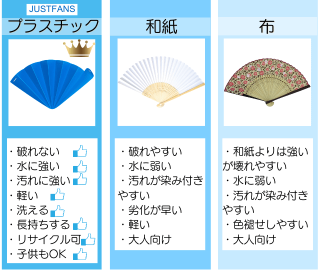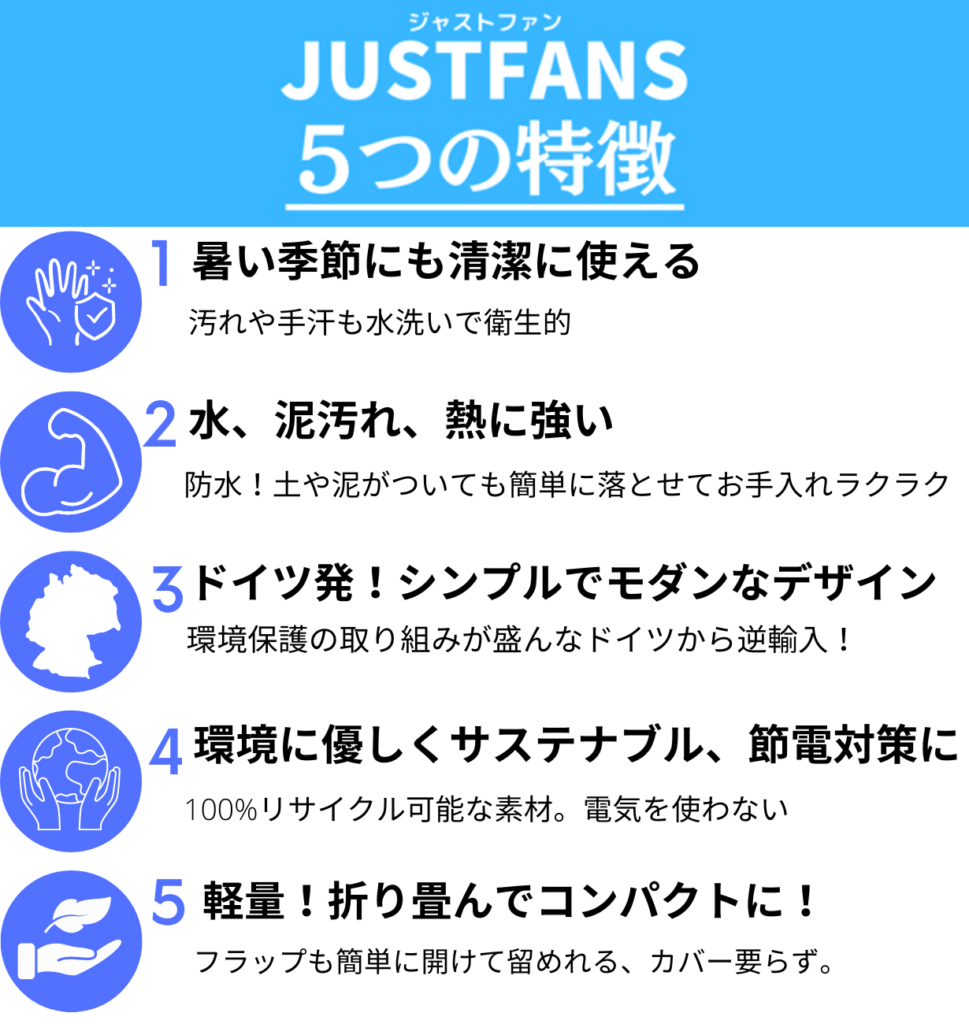 Elementor #11 4月24日10:00よりMakuakeにて先行発売開始しました! Makuakeプロジェクトページはこちら 『LINE友だち追加』で最大40%OFFの先行発売情報をお知らせ! ↓↓ 今すぐボタンをクリック! ↓↓ Makuakeプロジェクトページはこちら メールアドレスからもご登録出来ます! Δ ウォータープルーフ!ありそうでなかった水、汚れに強い扇子【JUSTFANS】 でも電気代も高いし、節電もしたい。 電車を待っている時、営業に行く時、車に入った瞬間、休みの日でも、 夏はエアコンの効いた部屋から出てしまえば、そこは灼熱。。。 そんなとき、一番身近なのが扇子やうちわですよね。 電気も使わないし、いつでもどこでも風を仰いで涼むことの出来る、夏には欠かせないグッズです。 従来の扇子は紙や布地などで出来ており、暑い季節に使うと汗や皮脂がついてしまい、繰り返し長期間使うのが困難なこともありました。一方で、JUSTFANSは汚れがつきにくく、水洗、水拭きができるため、清潔に使用することが出来ます。 木製や紙製の扇子は壊れやすかったり、水に濡れると傷みますが、JUSTFANSはウォータープルーフで土や泥、砂がついても簡単に汚れが落とせるため、手入れが簡単で便利!熱にも強く様々なシチュエーションでお使い頂けます。山や海、BBQなどアウトドアに最適です! とっても軽い!1つの扇子の重さは約27g!!! 様々な使い方がありますので生活スタイルに合わせた使い方、場所で利用することが出来ます。男性、女性問わず使えるデザインですので年齢性別問わずお使い頂けます!「涼しい」と「エコ」を両立する、JUSTFANSで 夏をもっとクールに過ごしませんか? いよいよ4月24日10:00!プロジェクト開始!!! Makuakeプロジェクトページはこちら LINEのお友だち登録も引続きお待ちしております! メールアドレスからもご登録出来ます! Δ
